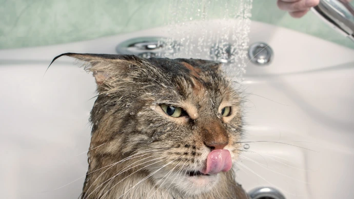 Напір води: Сильний гул душа може налякати тварину. Краще використовувати слабкий струмінь або просто поливати кота з ковшика.
